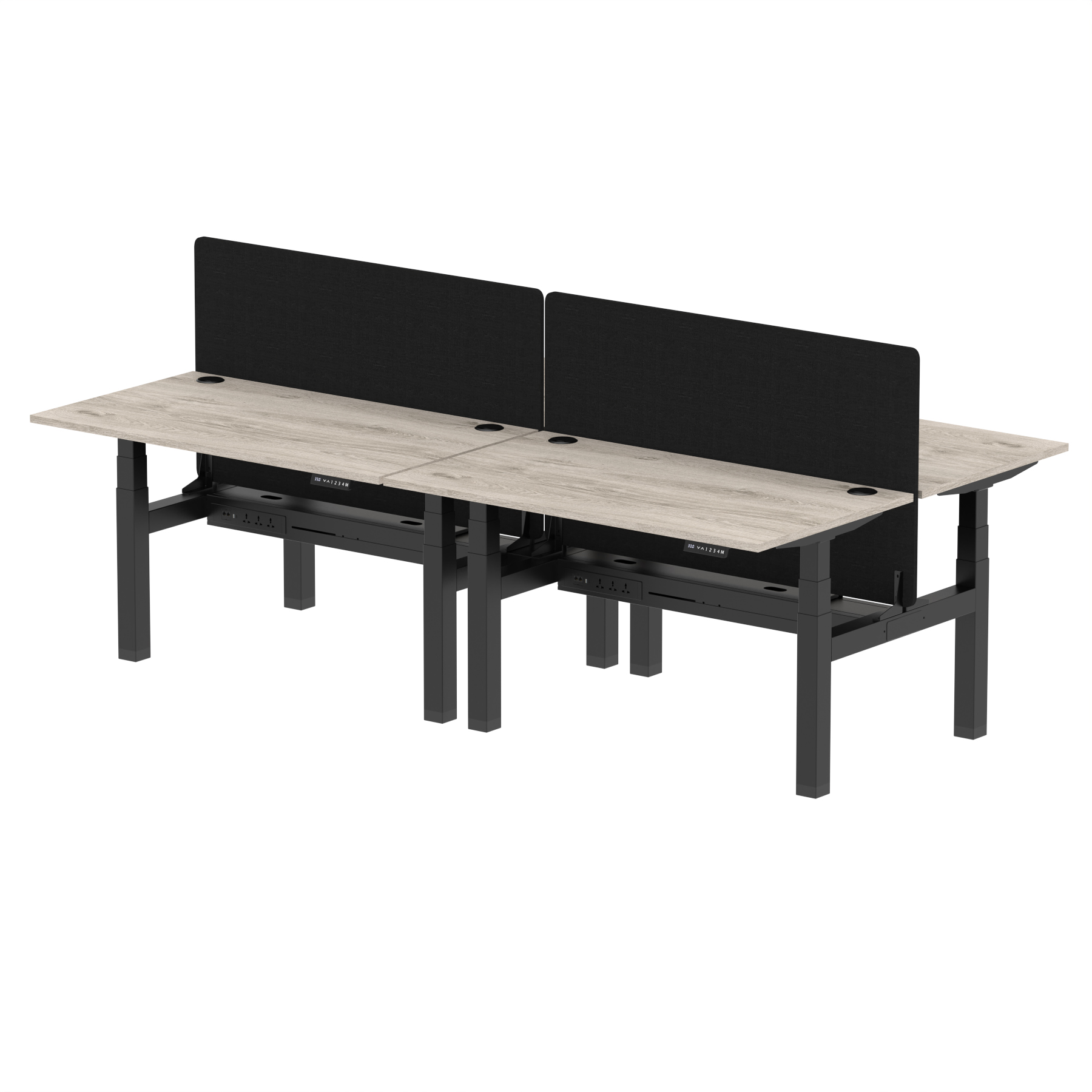 Elevate your office with the Air Back-to-Back Height Adjustable Desk for four, a blend of ergonomics and connectivity. Each desk includes two Ethernet ports, a USB and USB-C port, and three UK plugs, complemented by integrated cable ports for a clean setup. The addition of a dividing screen per duo offers privacy and focus. This desk is a perfect match for professionals seeking a tidy, tech-friendly, and adaptable workspace.