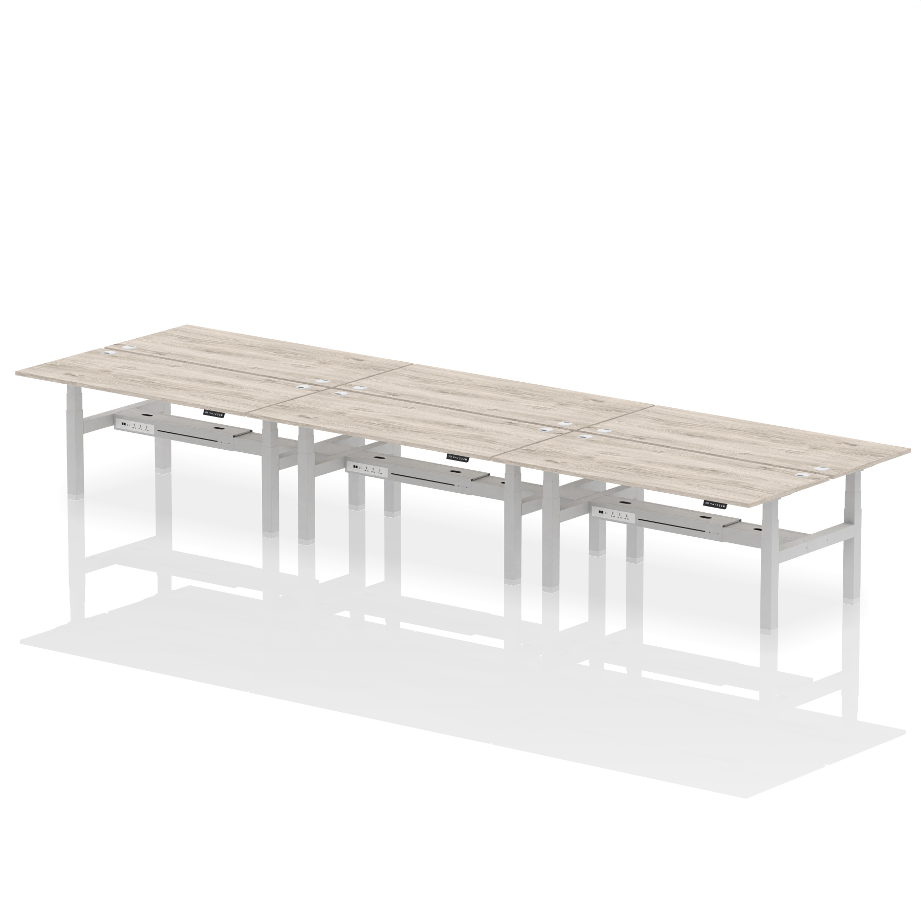 The Air Back-to-Back Height Adjustable Desk, designed for six, is the epitome of efficiency and connectivity. Each desk comes equipped with two Ethernet ports, a USB port, a USB-C port, and three UK plugs, catering to all digital needs. Integrated cable ports ensure a tidy workspace. Adjustable height options offer ergonomic comfort. This desk is the ultimate solution for teams seeking a connected, efficient, and adaptable workspace.