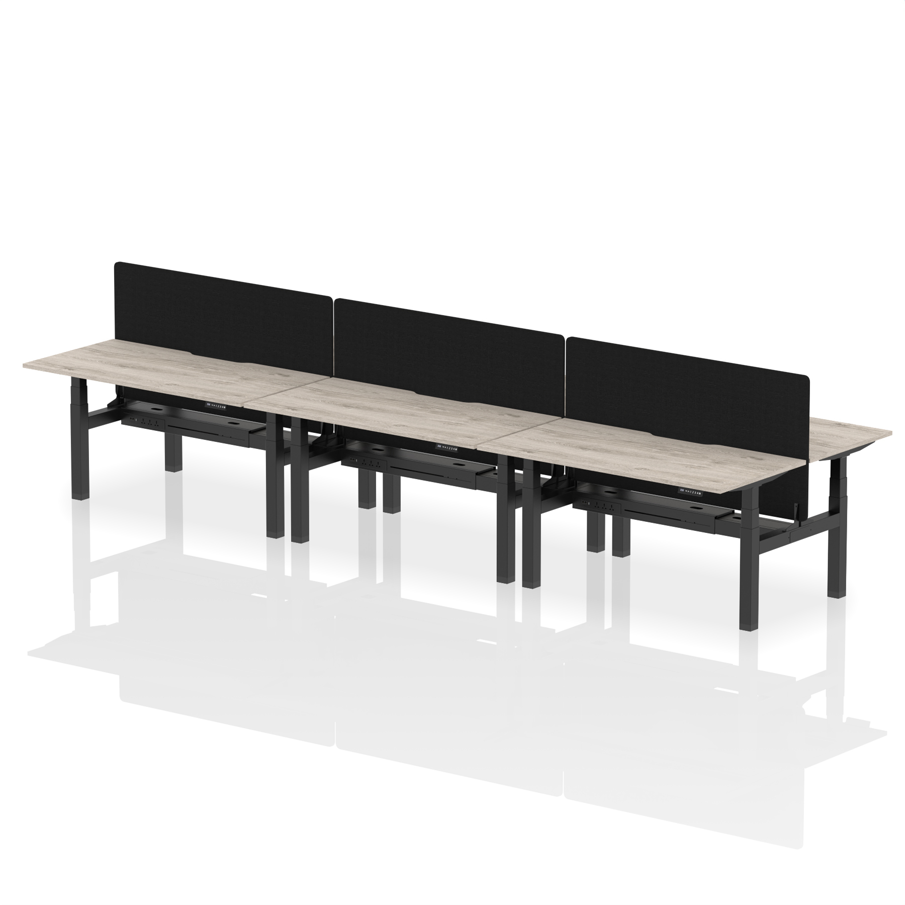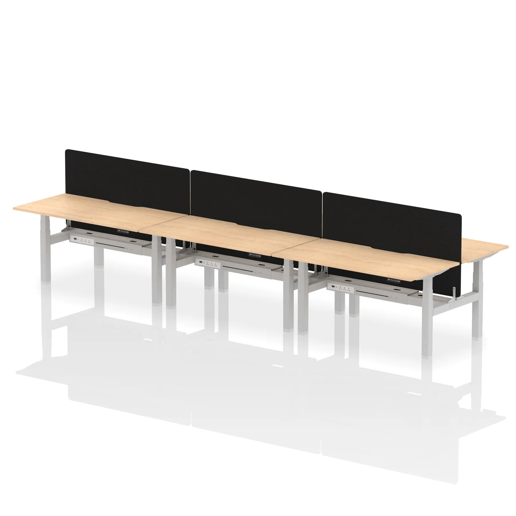 Experience cutting-edge collaboration with the Air Back-to-Back Height Adjustable Desk for six, featuring a unique scalloped edge design and a dividing screen per duo. Each desk is outfitted with two Ethernet ports, a USB port, a USB-C port, and three UK plugs, ensuring unparalleled connectivity. The adjustable height caters to ergonomic needs, making it perfect for dynamic teams who prioritize both style and functionality in their workspace.
