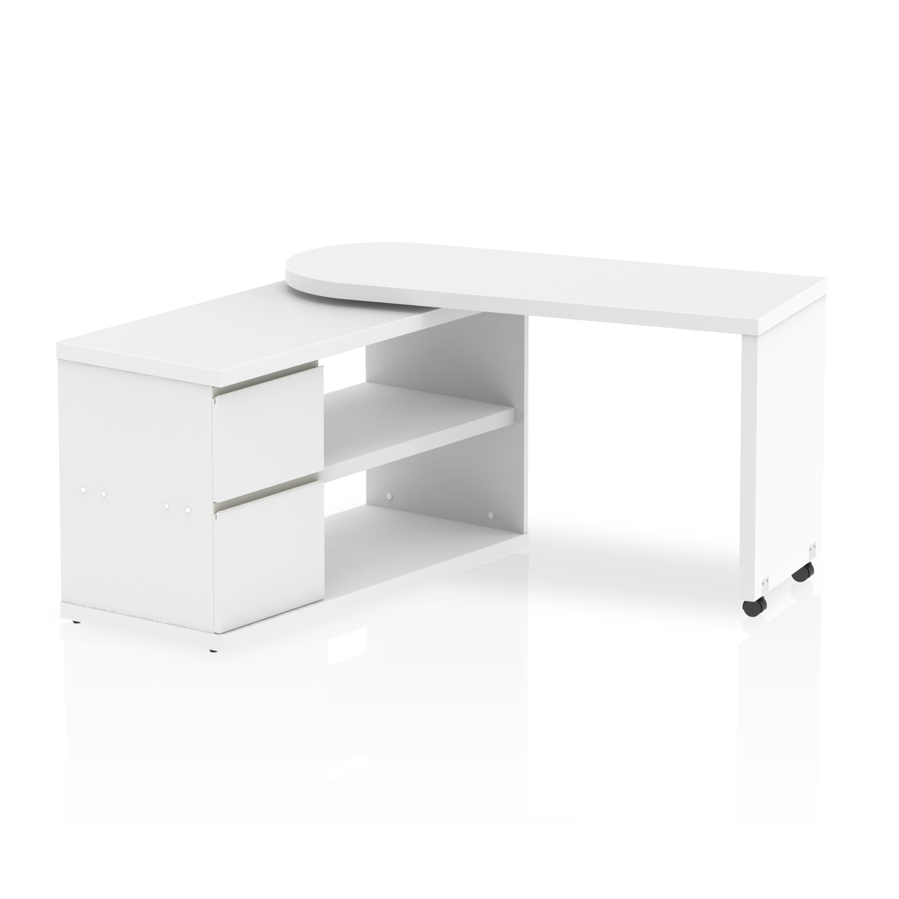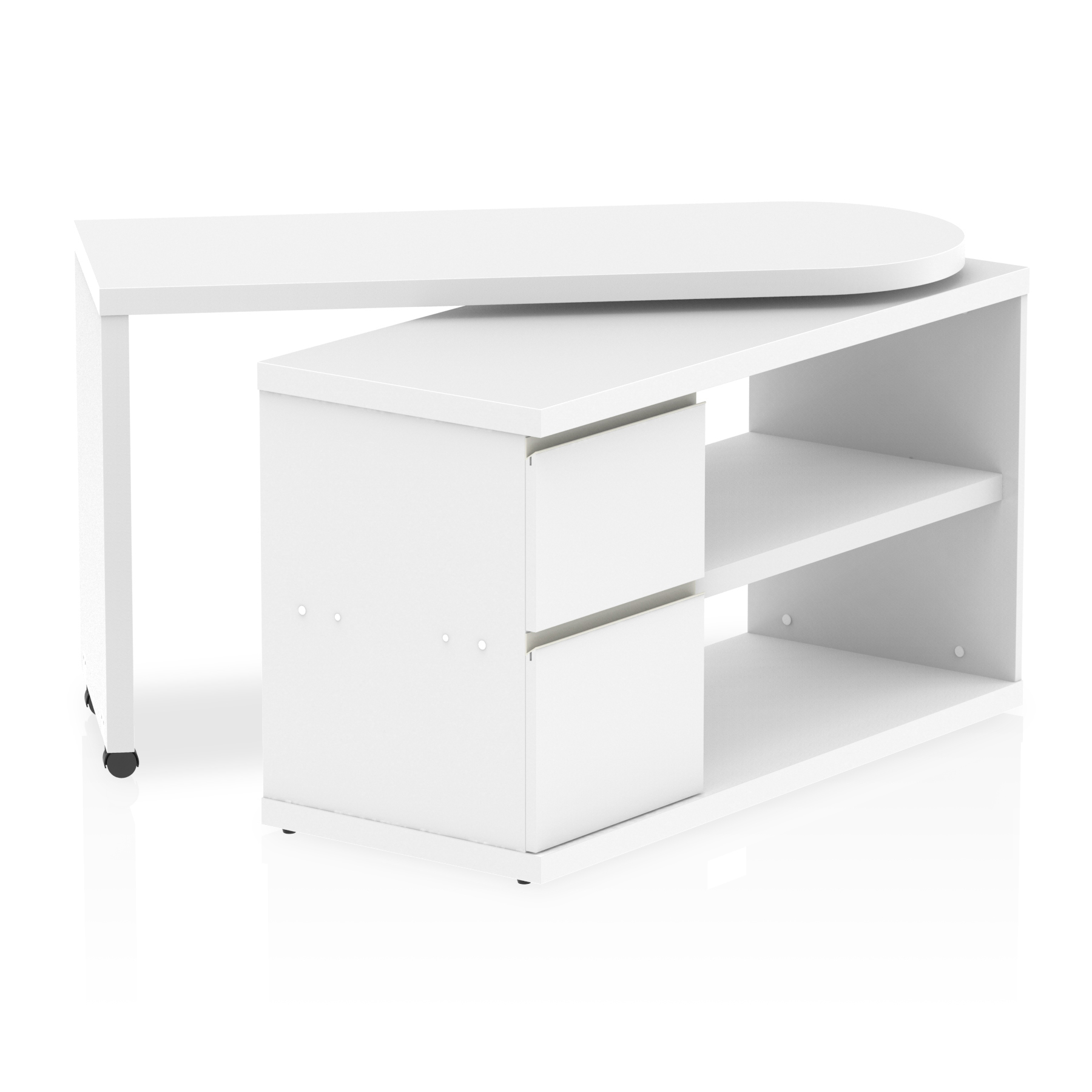 • Comprehensive, all-in-one desk and storage system • Desk top easily and conveniently stows away over shelves when not in use • 360 ° rotating, castor mounted desktop • Dual extra large drawers • Two fixed shelves • Substantial 40mm thick desktop • Can be assembled either Left or Right handed formations • Foolscap filing rails on bottom drawer • Available in Grey Oak or White finishes • Weight Capacity: Desk – 100Kg; Drawers & Shelves – 15Kg