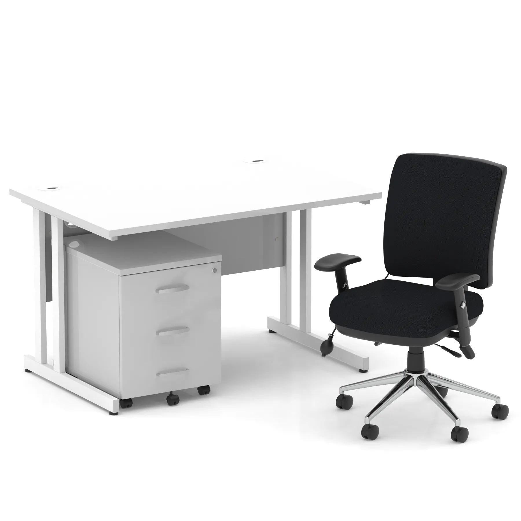 Impulse contract desk | 25mm tops | Heat resistant melamine finish | 18mm modesty panel | Double strut legs | Steel to steel fixings | Impulse mobile pedestal | Steel handles | Smooth running castors for mobility | Lockable drawers | Solid drawer construction | Chiro medium chair | Posture chair UK Chiropractic Doctor approved | Height adjustable back and seat | Pump lumbar support | Triple lever independent mechanism | Independent seat and backrest tilt angle adjustment | Gas lift tested up to 150kg | Usage: Task 24/7