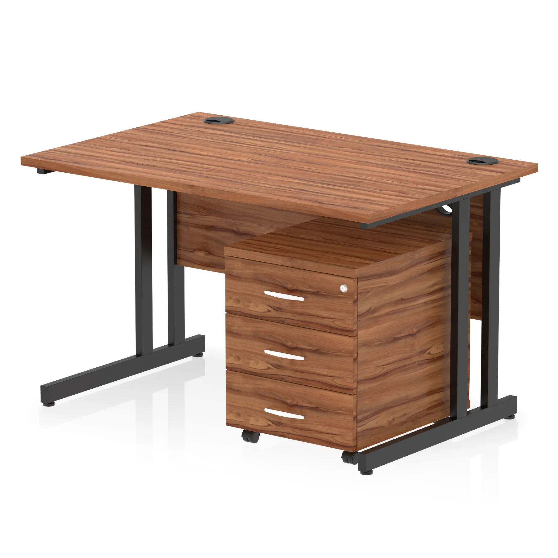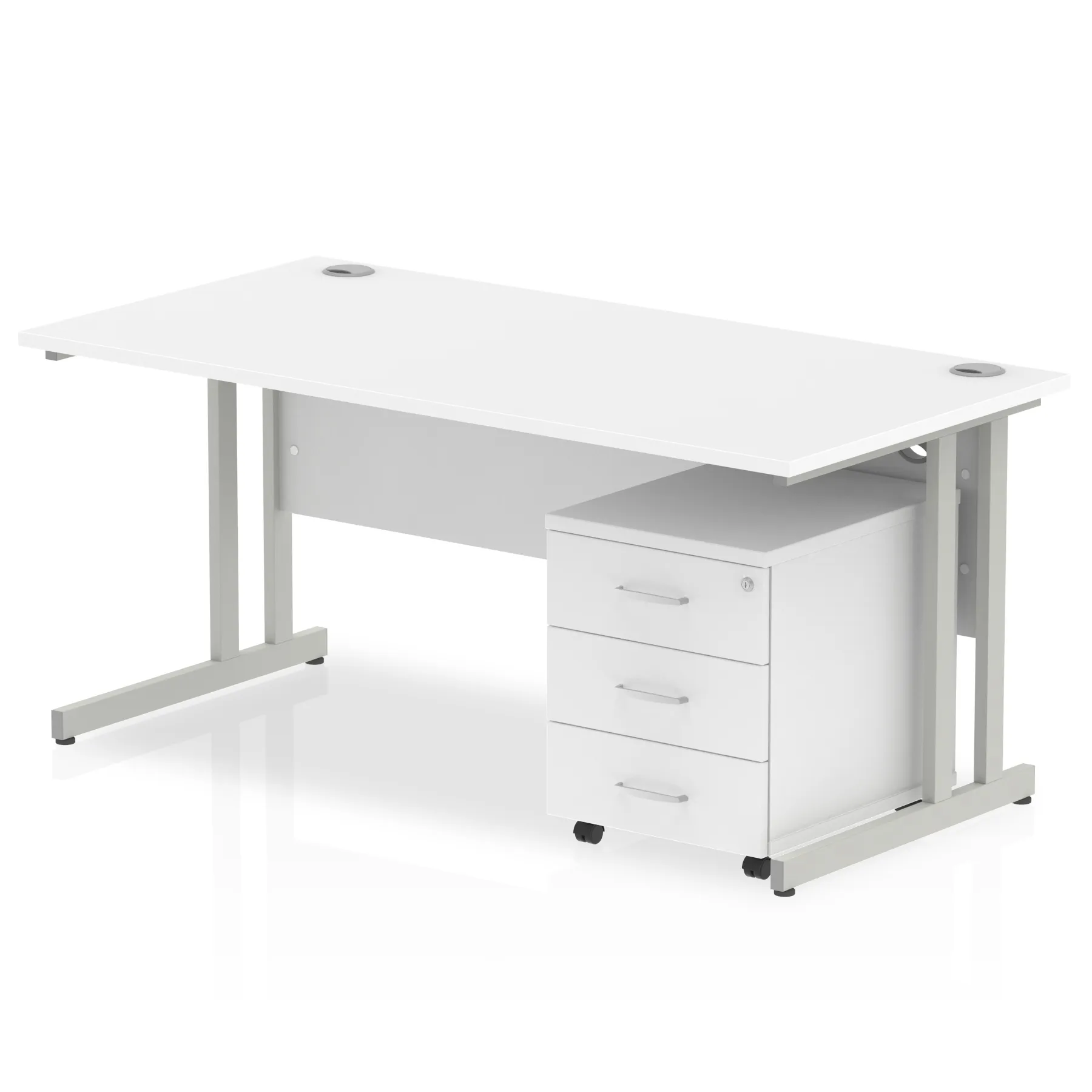 Impulse contract workstation | 25mm tops | Desk and pedestal combined | Heat resistant melamine finish | 18mm modesty panel | 2mm protective abs edging | Double strut legs | Multiple cable ports | Height adjustable feet | Steel to steel fixings | Modesty panel slots wire slots | Deep set modesty panel (5″) allows for compatibility of most screen clamp fittings