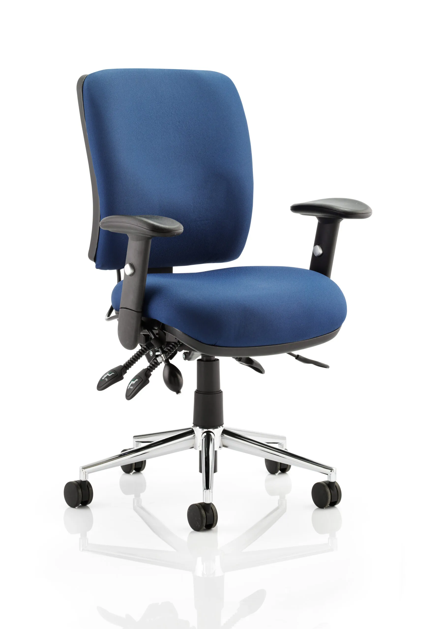 Impulse contract desk | 25mm tops | Heat resistant melamine finish | 18mm modesty panel | Double strut legs | Steel to steel fixings | Impulse mobile pedestal | Steel handles | Smooth running castors for mobility | Lockable drawers | Solid drawer construction | Chiro medium chair | Posture chair UK Chiropractic Doctor approved | Height adjustable back and seat | Pump lumbar support | Triple lever independent mechanism | Independent seat and backrest tilt angle adjustment | Gas lift tested up to 150kg | Usage: Task 24/7