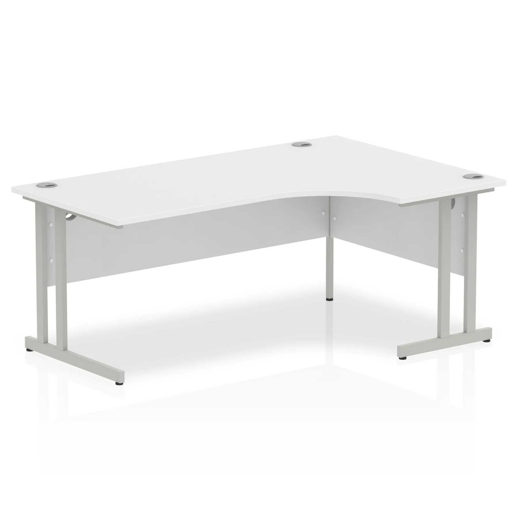 Impulse contract 1400 wide crescent desk | 25mm tops | Heat resistant beech melamine finish | 18mm modesty panels | 2mm protective abs edging | Silver coated double strut legs | 3 cable ports | Height adjustable feet | Steel to steel fixings | 3 modesty panels slots | 600 deep | Deep set modesty panel (5″) allows for compatibility of most screen clamp fittings | Weight Capacity 135Kg