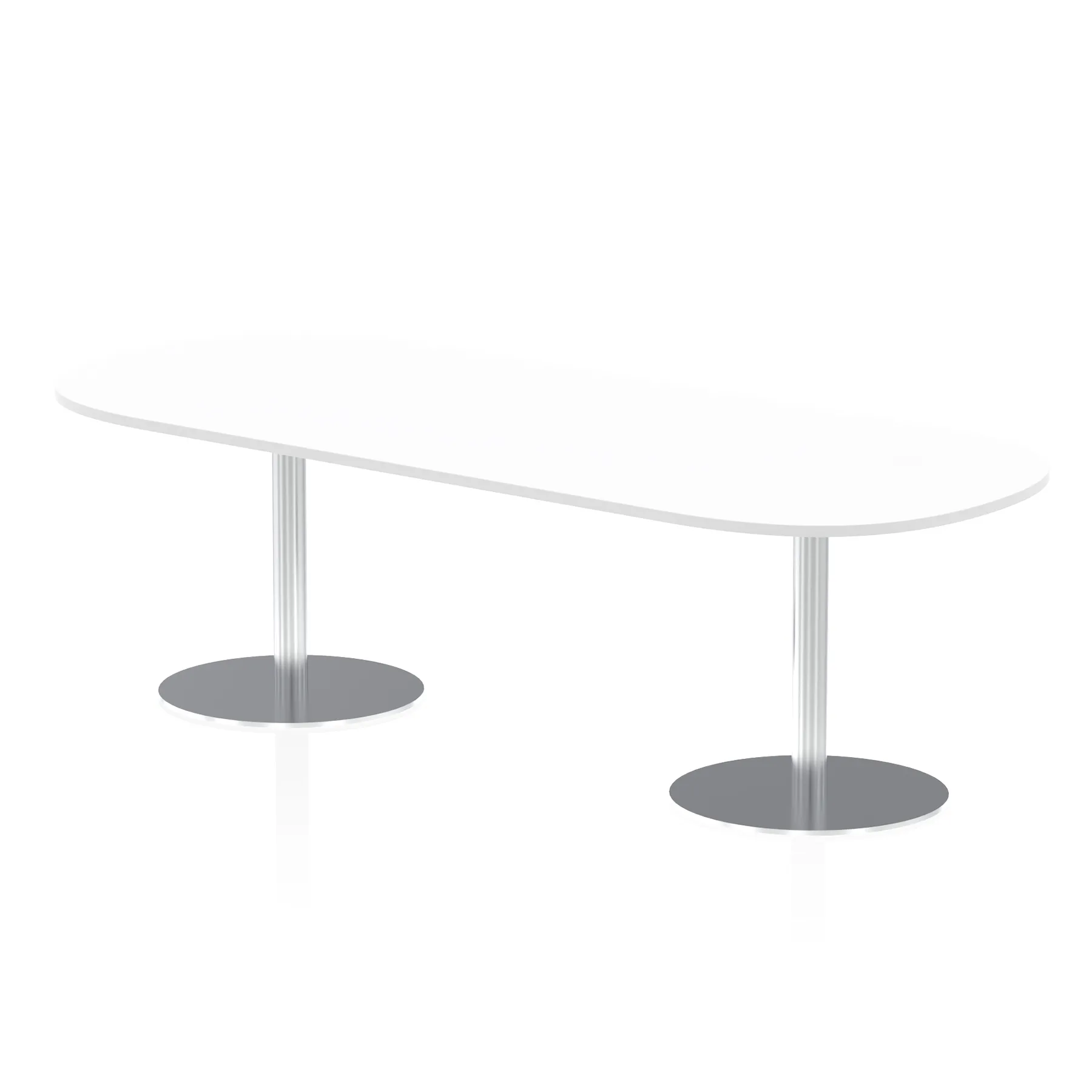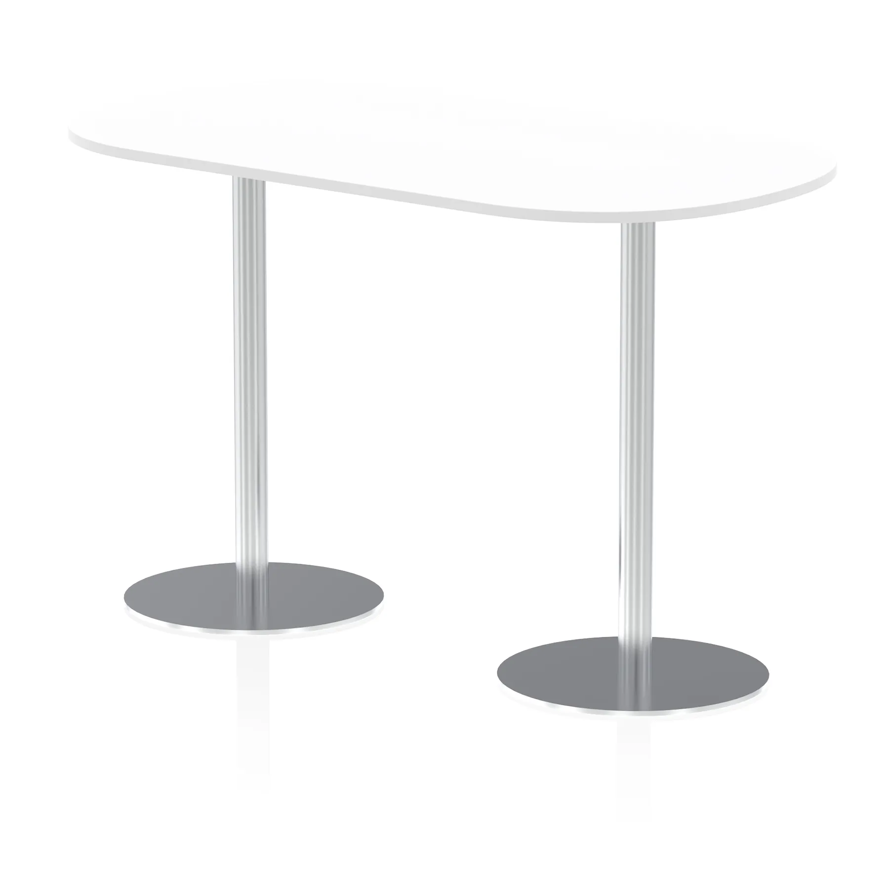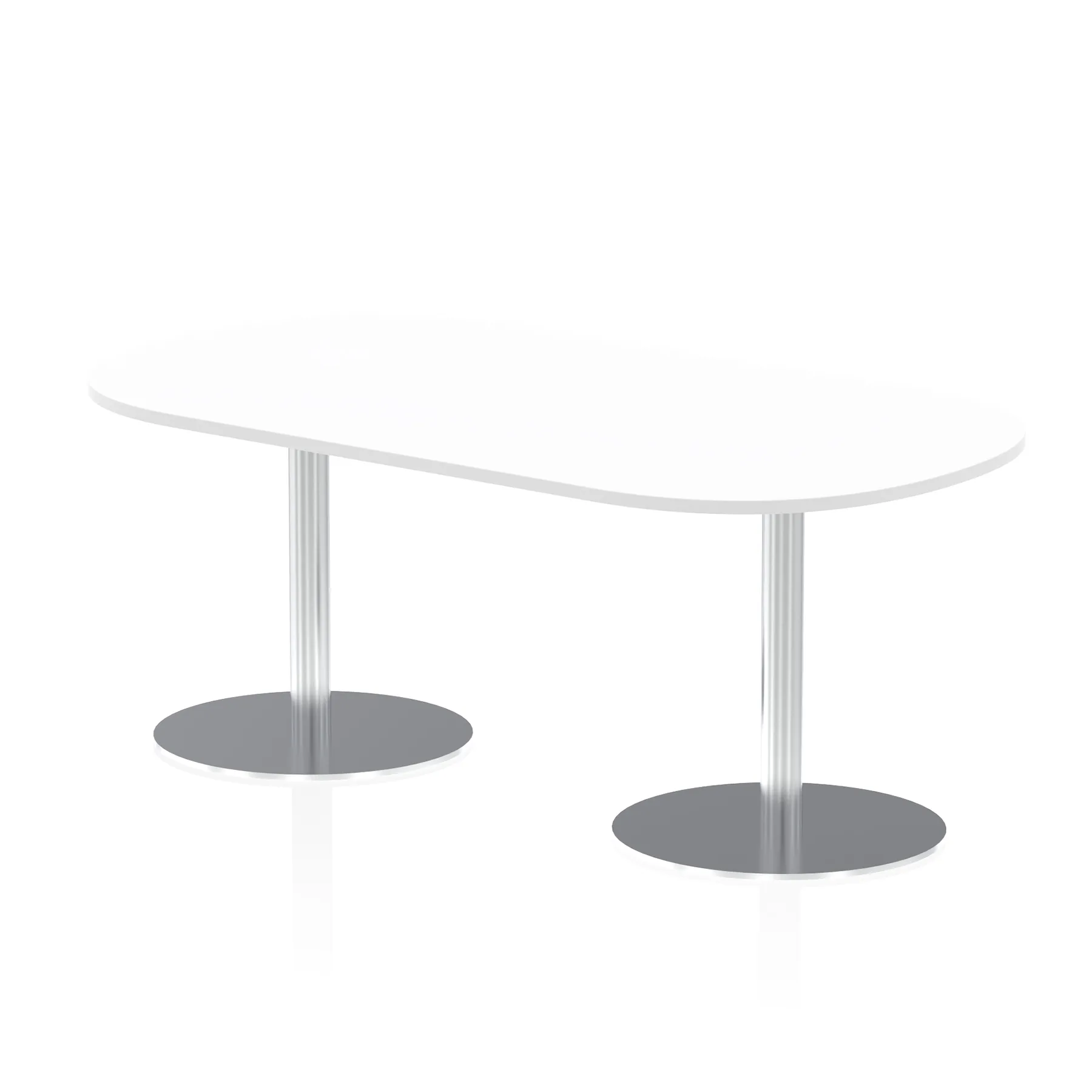 25mm thick desk top profile | Dual, brushed stainless steel effect circular base (580mm diameter) | Brushed stainless steel pillars (76mm diameter) | Weighted base provides stability | Two part bolted frame system