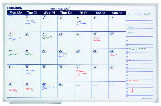• Monthly Planner • Monthly planner displays a whole month’s planning • Project planning for a full month on show and overview column for the next month • Magnetic board surface with silver anodised aluminium frame • Includes marker tray and mounting kit • Board size: 900x600mm (WxH) • Grid Size: 96 x 98mm