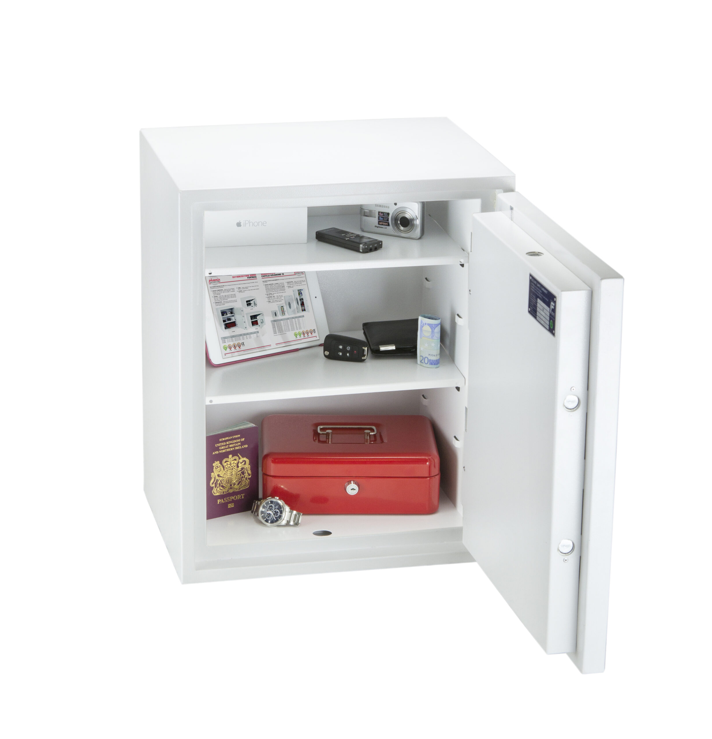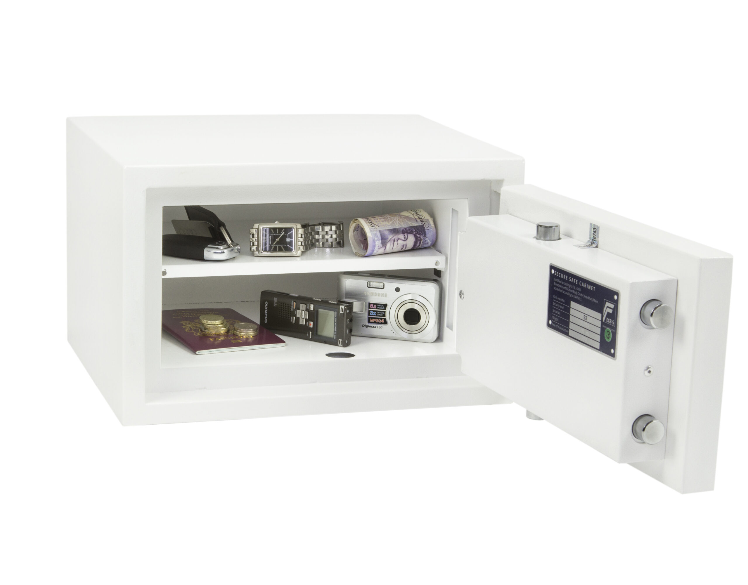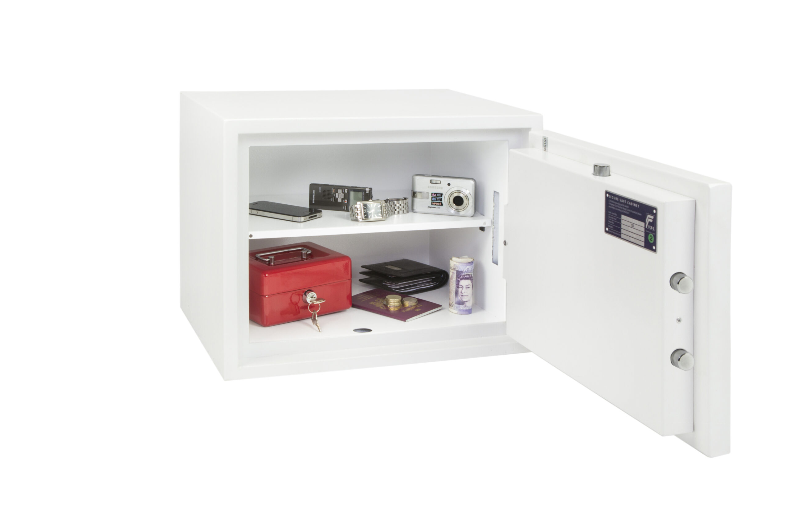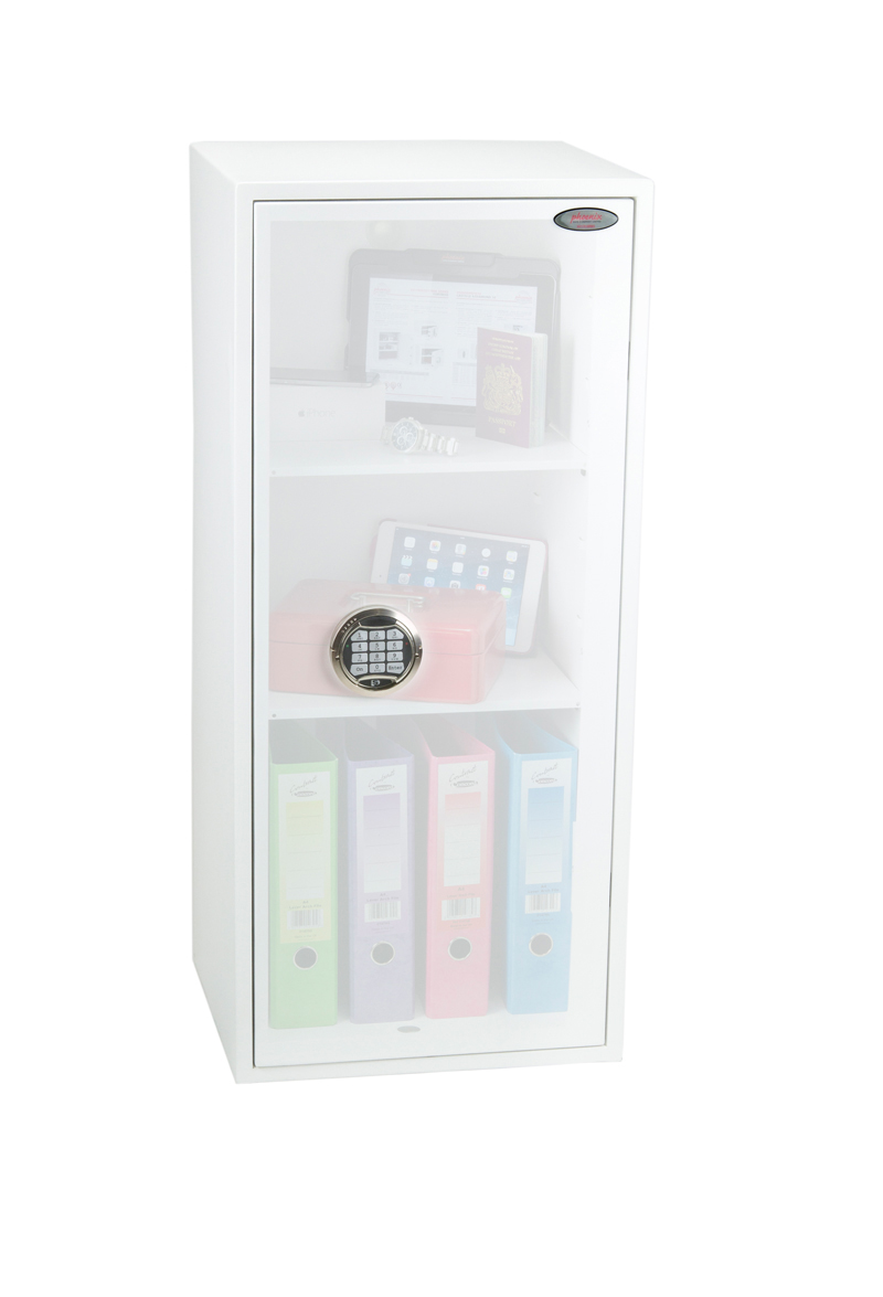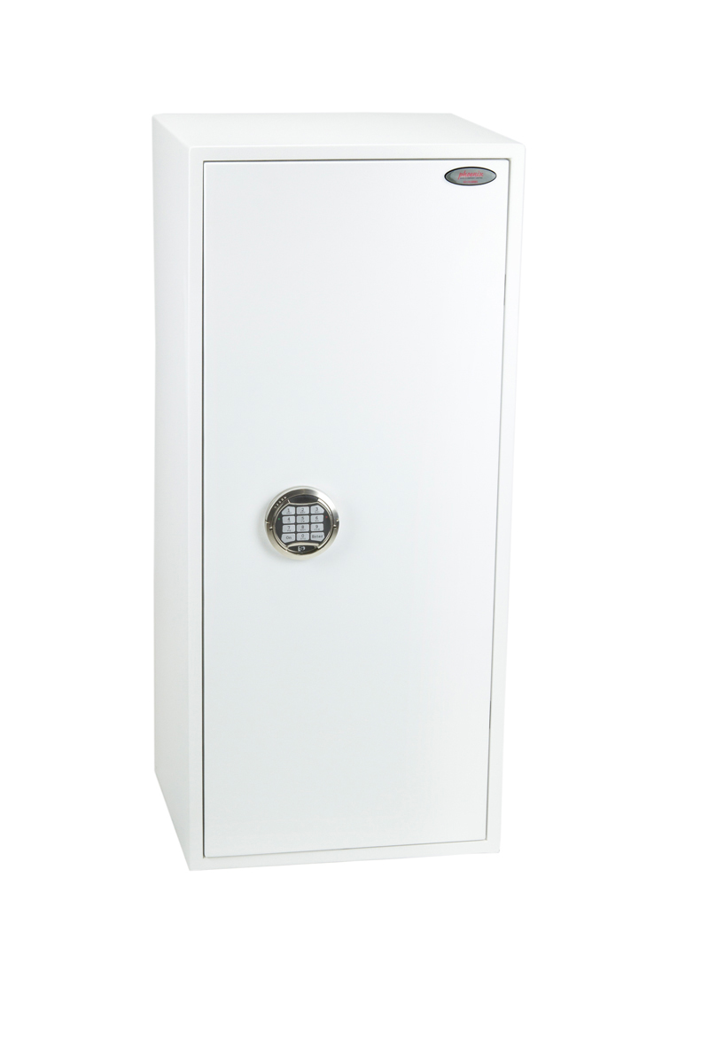 SECURITY PROTECTION – Tested to the prestigious European S2 Security standard (EN14450 – ECB.S Certified) giving cash cover of £4,000 or Valuables cover of £40,000 | APPROVALS – UK Police approved (Secured by Design scheme) and the Association of Insurance Surveyors (AiS) | CONSTRUCTION – Double wall construction with anti drill plates and re-locker protection for the door provide a safe of great strength | FIXING – Ready prepared for floor fixing, with fixing bolts for concrete supplied | COLOUR – Finished in a high quality scratch resistant White paint RAL9003 | Suitable for storage of controlled drugs whose active ingredients do not exceed 500 grams