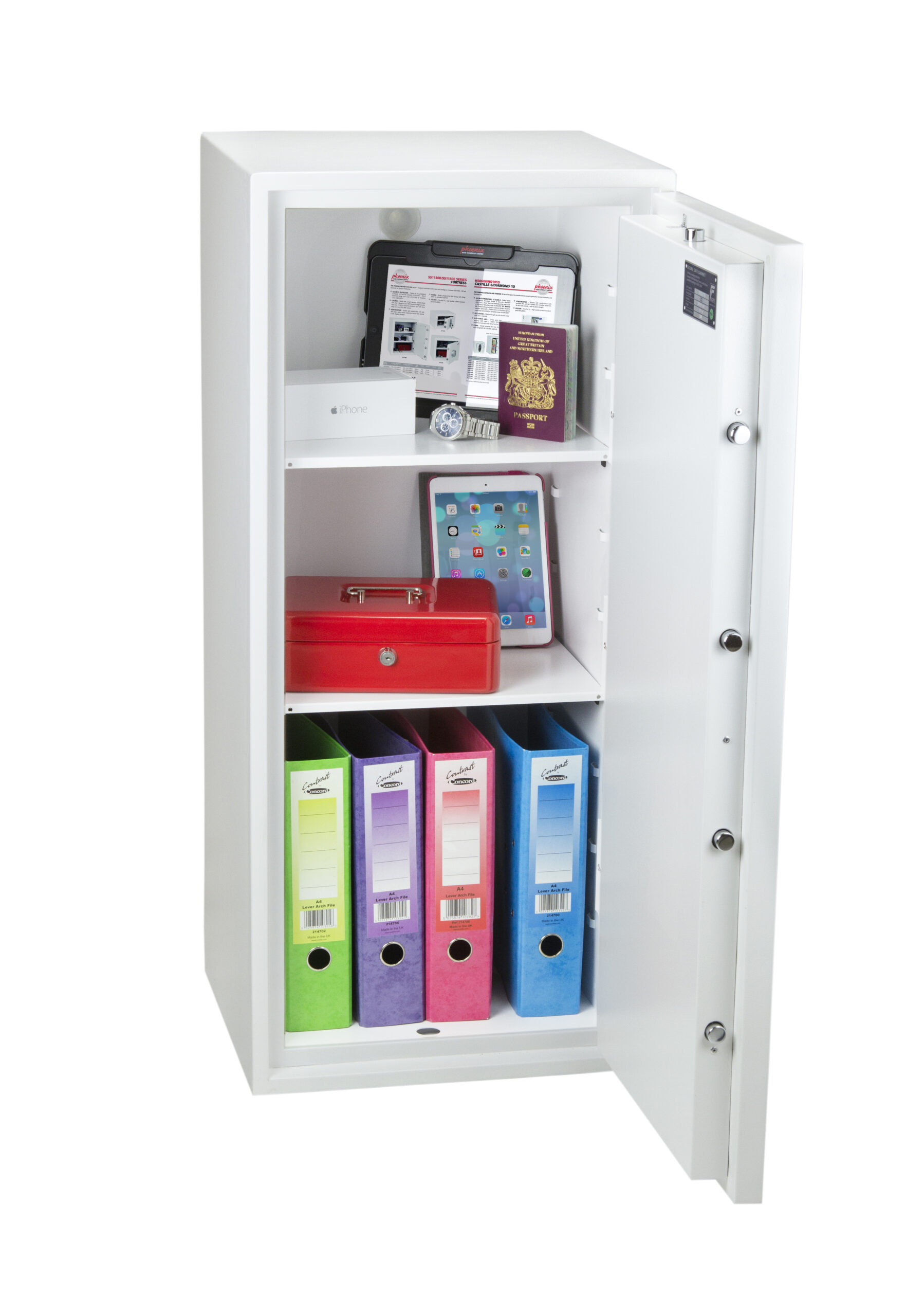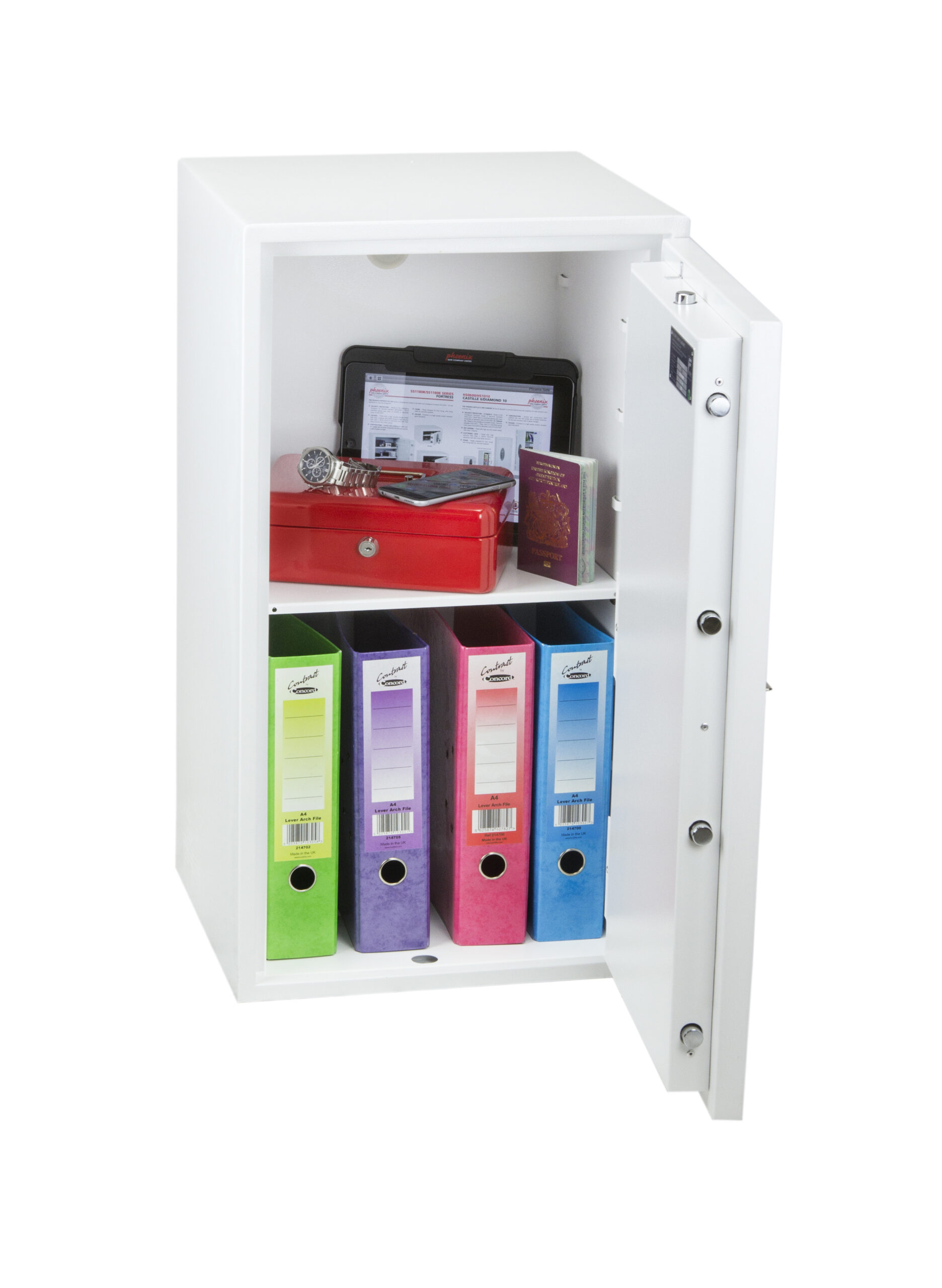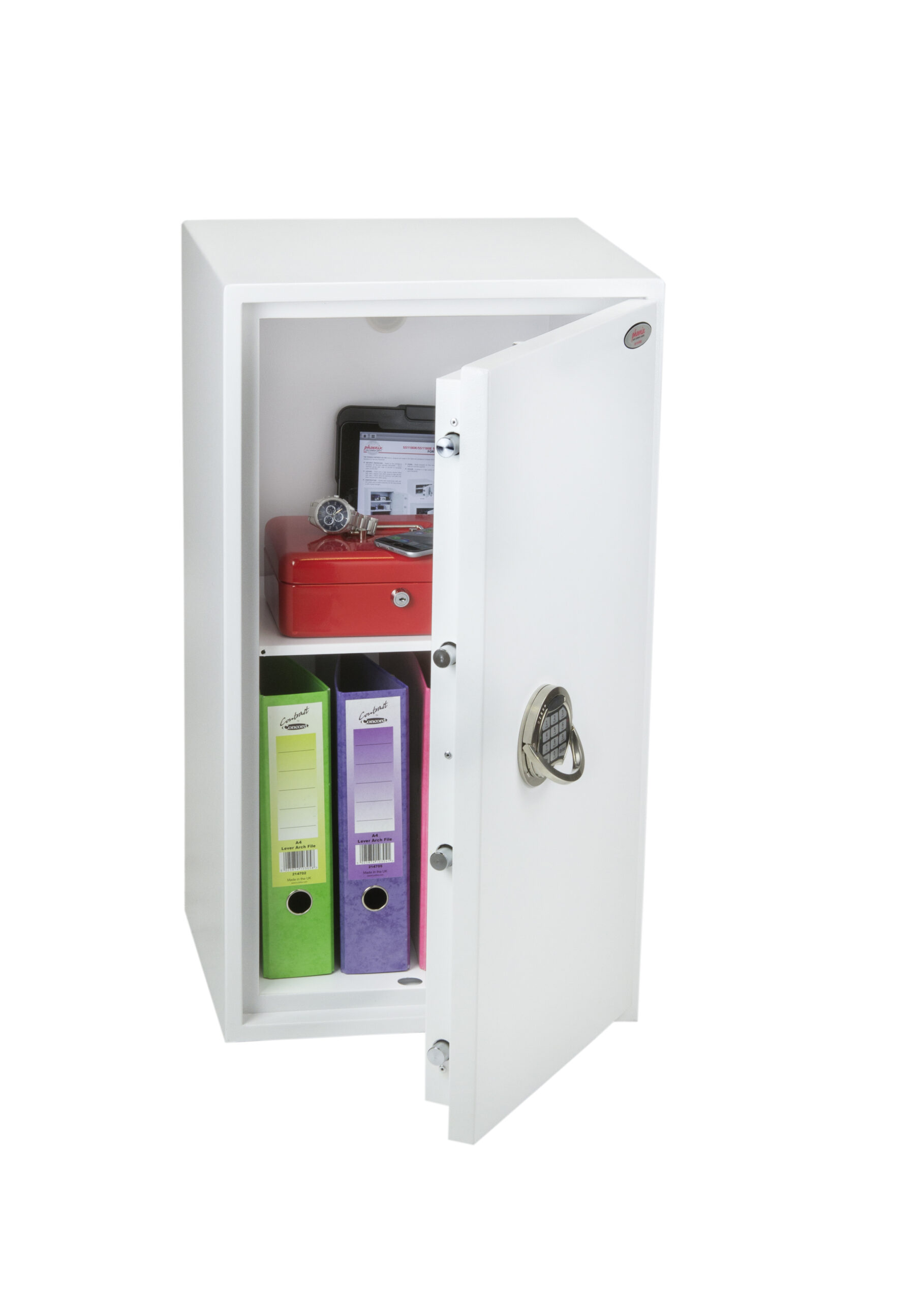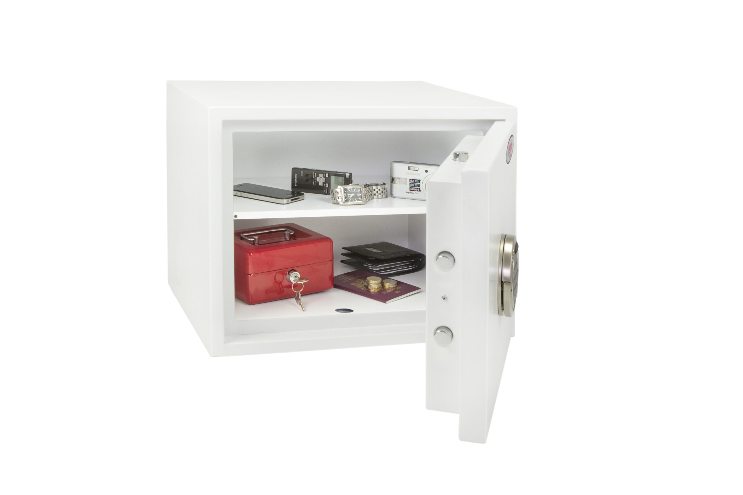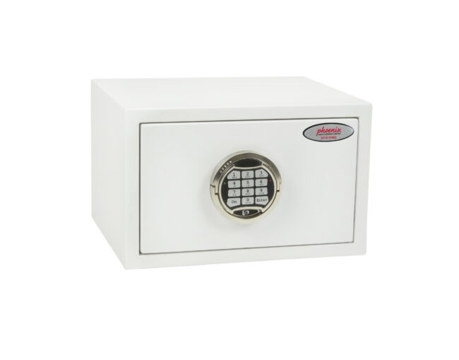 SECURITY PROTECTION – Tested to the prestigious European S2 Security standard (EN14450 – ECB.S Certified) giving cash cover of £4,000 or Valuables cover of £40,000 | APPROVALS – UK Police approved (Secured by Design scheme) and the Association of Insurance Surveyors (AiS) | CONSTRUCTION – Double wall construction with anti drill plates and re-locker protection for the door provide a safe of great strength | FIXING – Ready prepared for floor fixing, with fixing bolts for concrete supplied | COLOUR – Finished in a high quality scratch resistant White paint RAL9003 | Suitable for storage of controlled drugs whose active ingredients do not exceed 500 grams