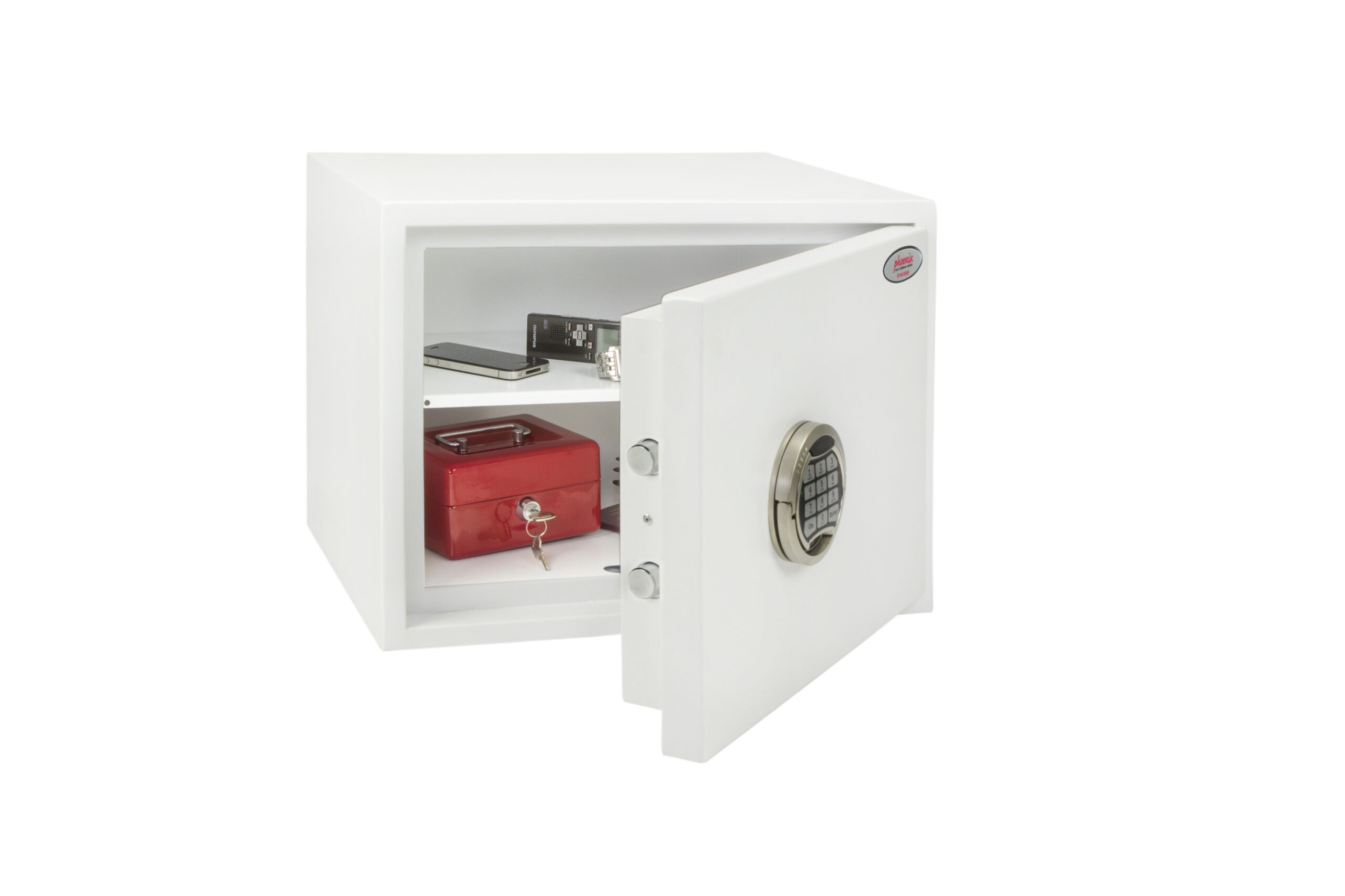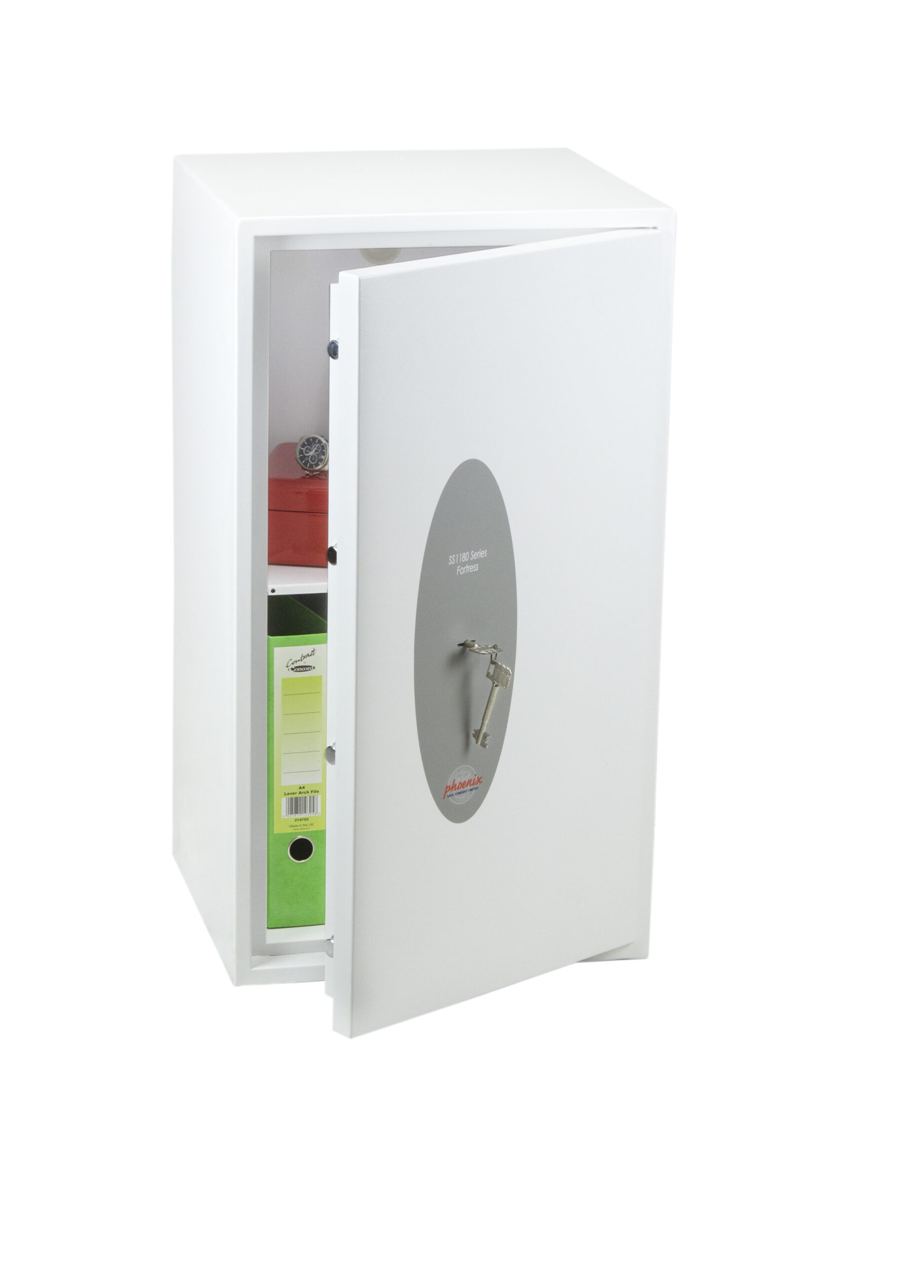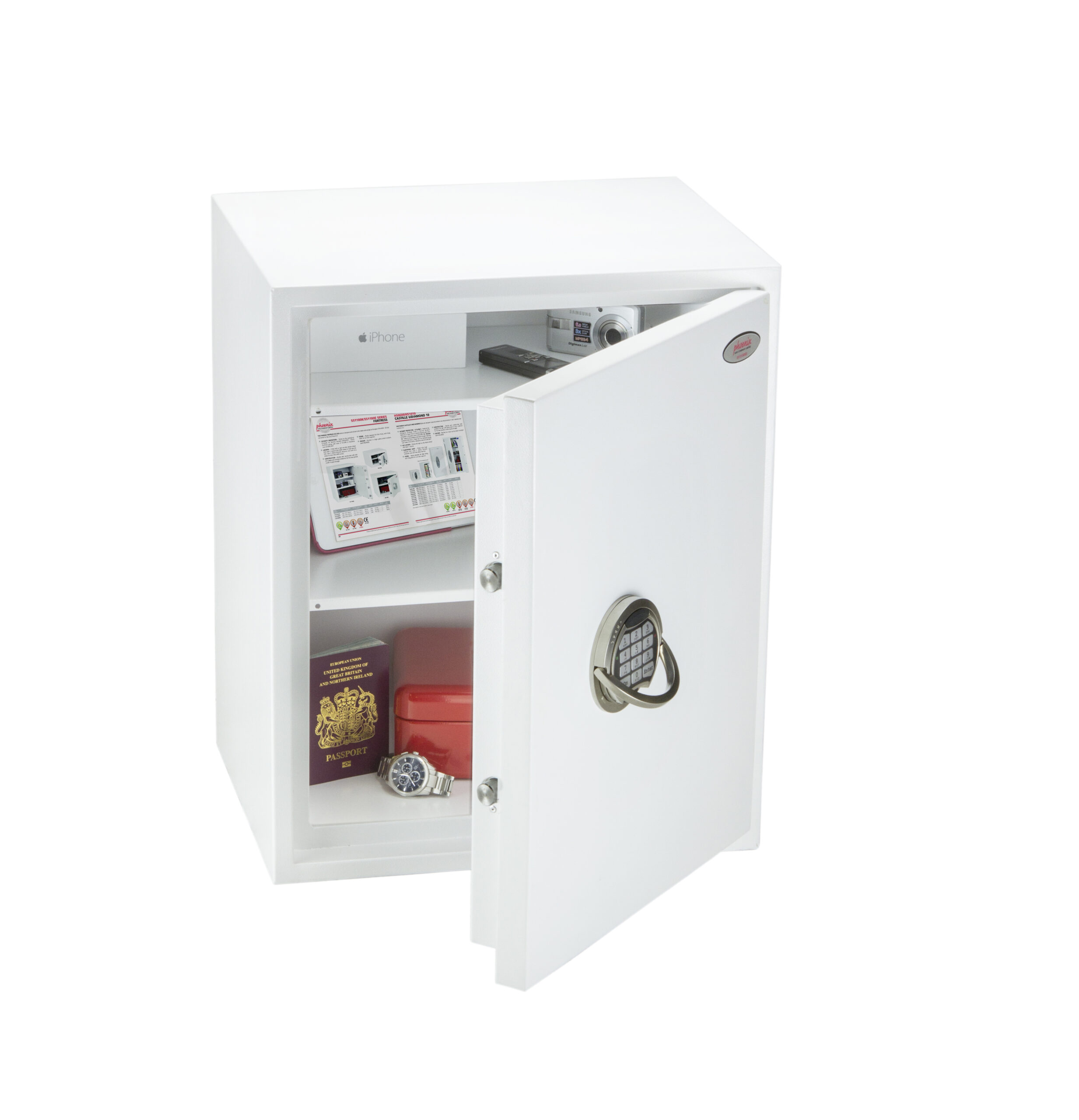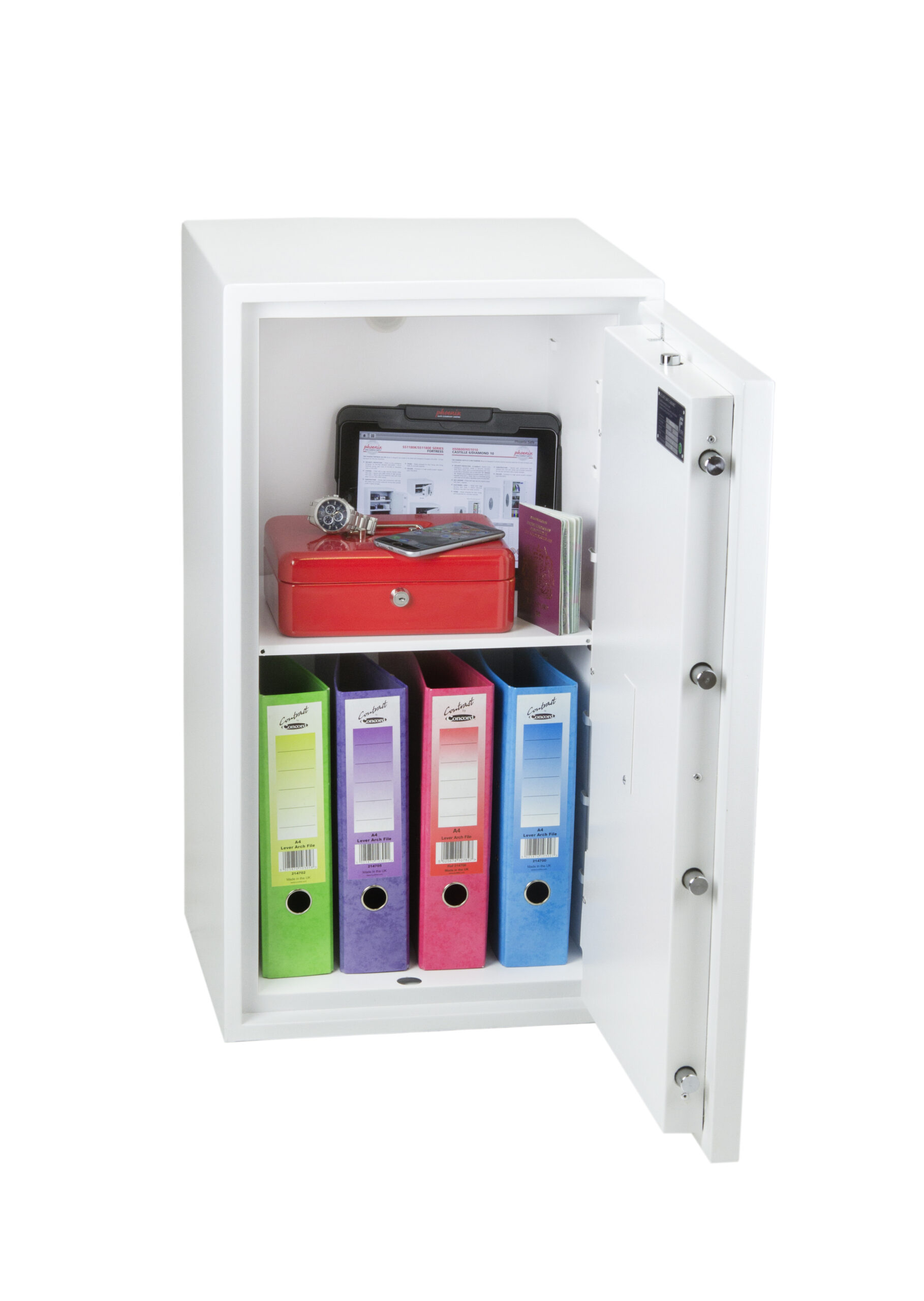 SECURITY PROTECTION – Tested to the prestigious European S2 Security standard (EN14450 – ECB.S Certified) giving cash cover of £4,000 or Valuables cover of £40,000 | APPROVALS – UK Police approved (Secured by Design scheme) and the Association of Insurance Surveyors (AiS) | CONSTRUCTION – Double wall construction with anti drill plates and re-locker protection for the door provide a safe of great strength | FIXING – Ready prepared for floor fixing, with fixing bolts for concrete supplied | COLOUR – Finished in a high quality scratch resistant White paint RAL9003 | Suitable for storage of controlled drugs whose active ingredients do not exceed 500 grams